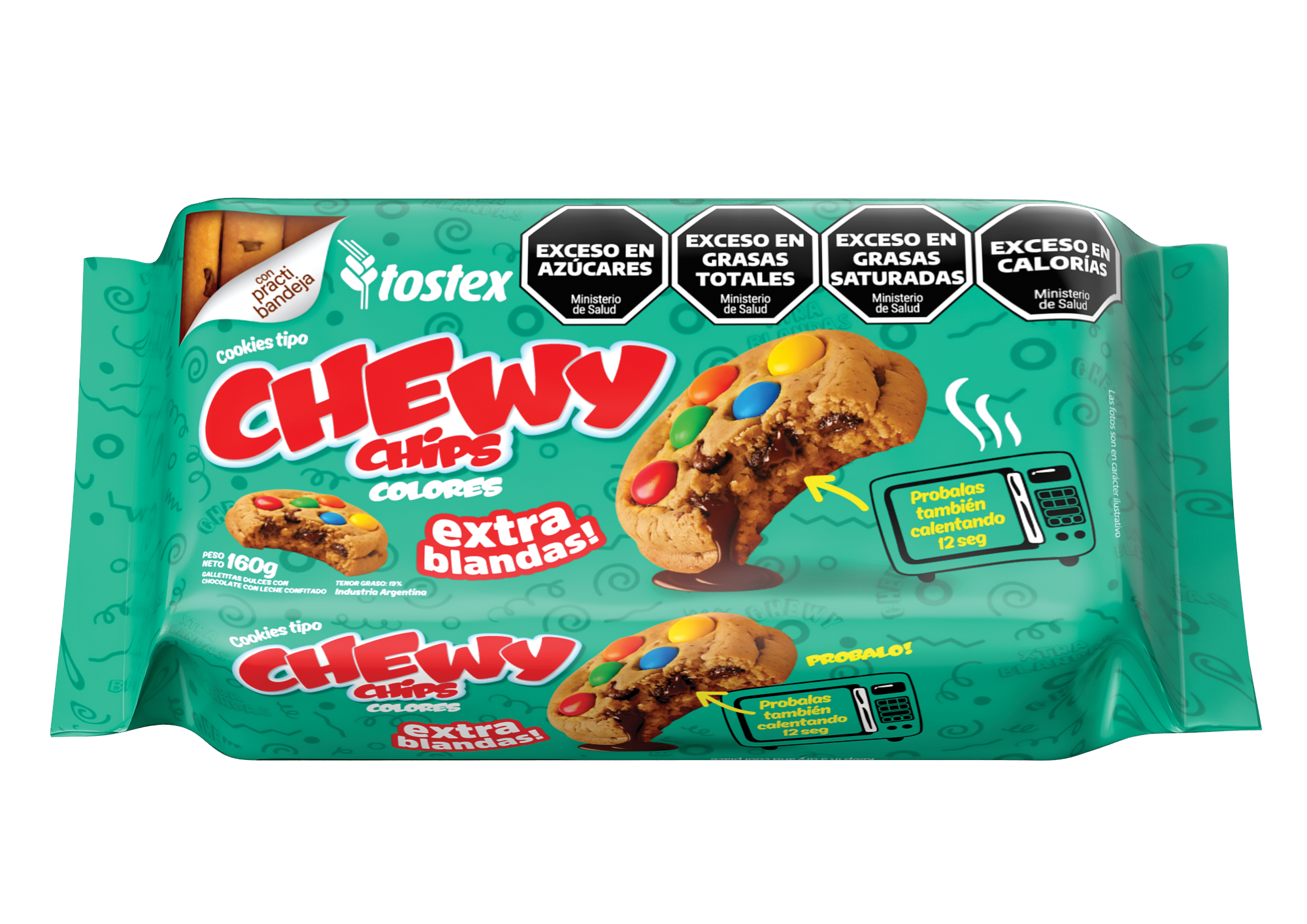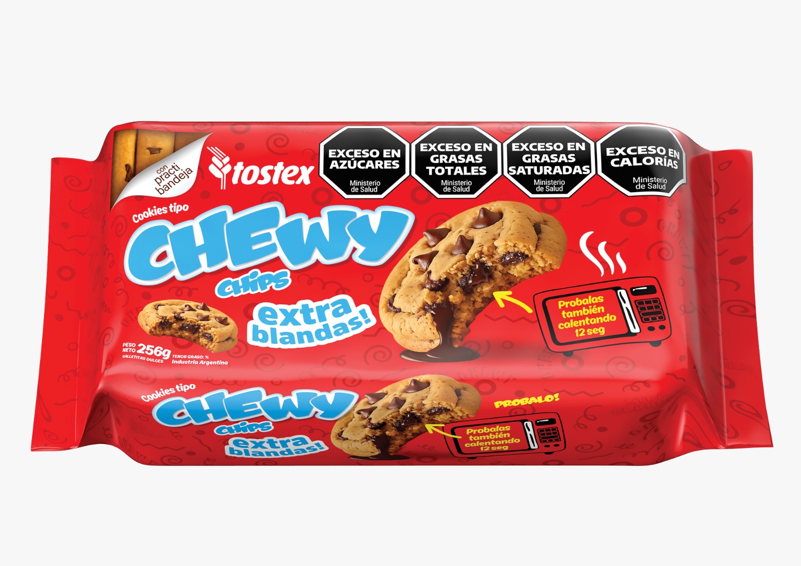 INGREDIENTES: Harina de trigo enriquecida según Ley 25630 (harina, hierro 30 mg/kg, ácido fólico 2,2 mg/kg, vitamina B1 6,3 mg/kg, vitamina B2 1,3 mg/kg, niacina 13,0 mg/kg); azúcar; avena arrollada; aceite de girasol alto oleico; chips de chocolate (azúcar, aceite vegetal hidrogenado, cacao en polvo, EMU (INS 422), ARO: (vainilla)); jarabe de maíz de alta fructosa; sal; leudantes químicos: bicarbonato de amonio (INS 503ii), bicarbonato de sodio (INS 500ii), fosfato monocálcico (INS 341i); emulsionante: lecitina de soja; aromatizante artificial sabor vainilla.