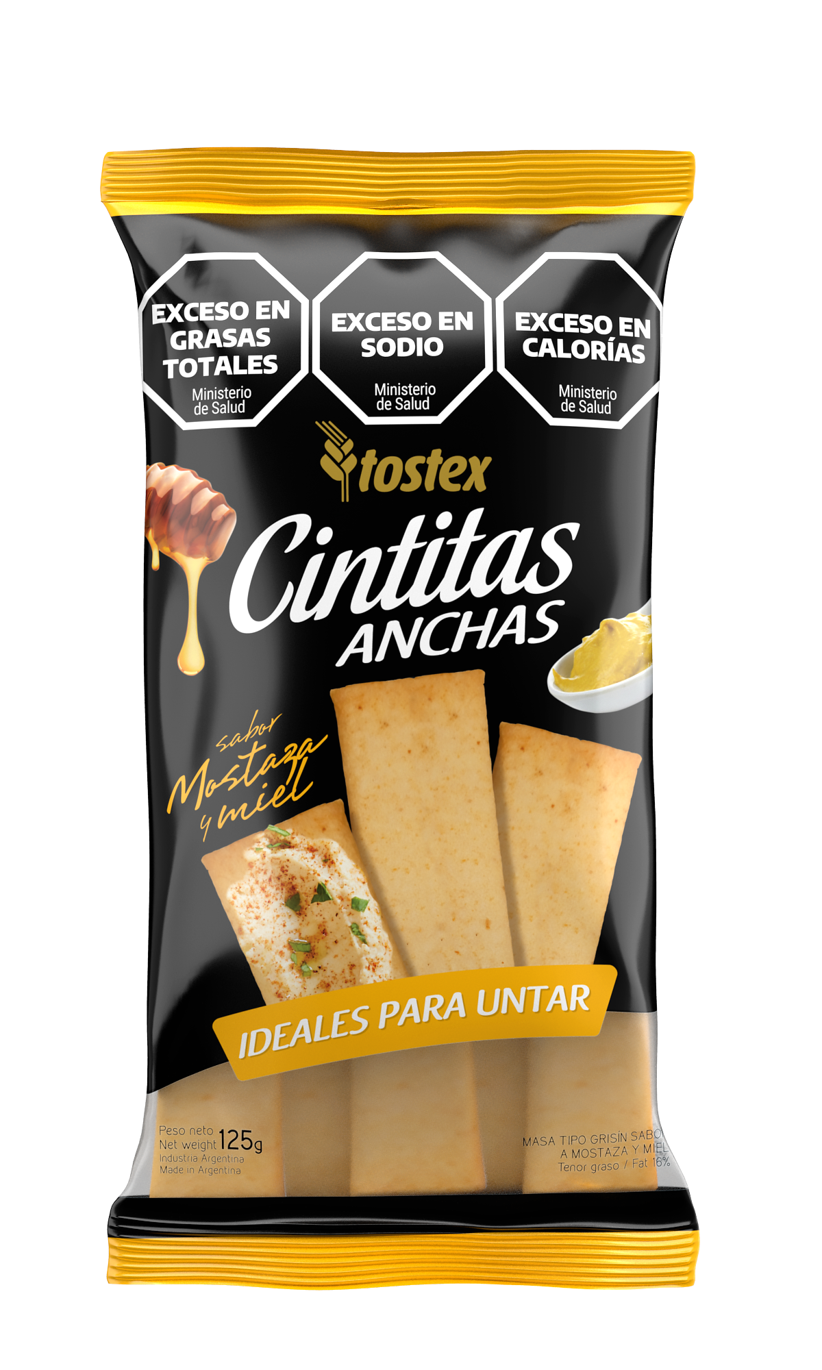 INGREDIENTES: Harina de trigo enriquecida según Ley 25630 (harina, hierro 30 mg/kg, ácido fólico 2,2 mg/kg, vitamina B1 6,3 mg/kg, vitamina B2 1,3 mg/kg, niacina 13,0 mg/kg); aceite alto oleico; azúcar; sal; ARO: viena y mostaza; EMU: INS 322; AC REG: INS 500 ii; FLO: INS 223.